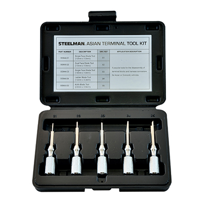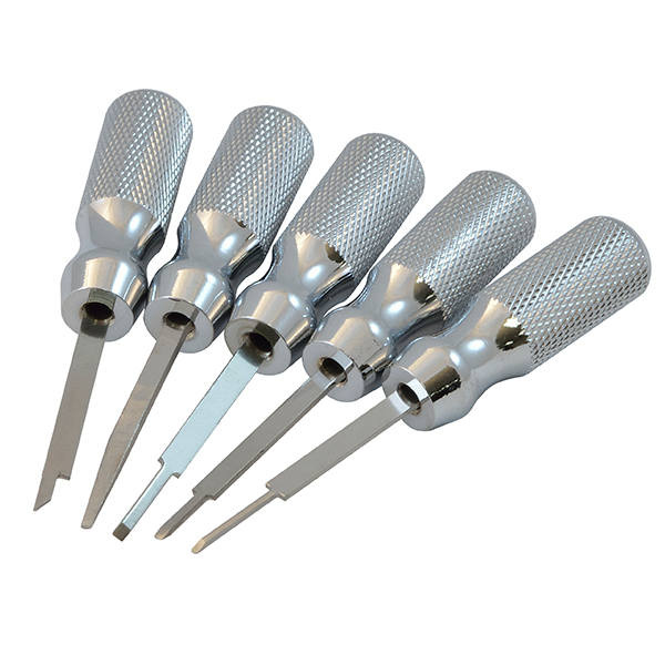 Precision pin tools For terminal repair on harness connectors. Safely removes pins without damaging wires. Available in 5 piece set.