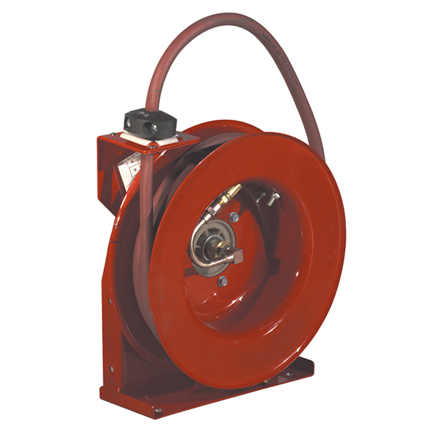 Hose withdraws freely from reel and retrieves quickly and positively. Ratchet holds hose at any desired length until released. Easily installed on ceiling, wall or floor with 50’ of 3/8” hose. Shipping weight 22 lbs.