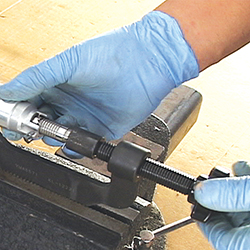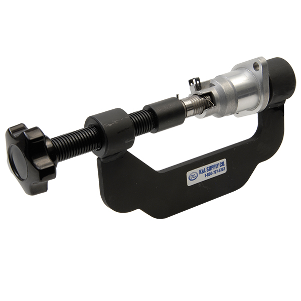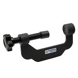 Here’s a better way to make a coMMon job faster and easier. This tool allows easy re-setting of the cam chain tensioner mechanism on the Yamaha R-1. The threaded C-Clamp design lets you gradually compress the unit, making re-installation of the tensioner easier. A rubber pad at the receiving end of the tool prevents marring or scratches, while the body of the tool includes a convienient tab that makes it possible to mount it in a bench vice For hands free operation