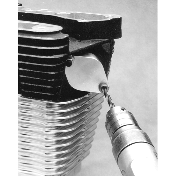 Designed to guide and align bit in order to drill out broken exhaust studs. A follow up with a tap is all that is needed to clean up threaded hole. This tool can be used with motor in the frame in most cases.