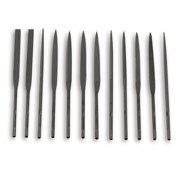 12 PIECE SWISS NEEDLE FILE SET Features round, knurled handles. 6-1/4 long. Great For cleaning 2-stroke ports, 4-stroke cylinder heads and more. Comes in plastic storage pouch.