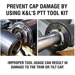 The new K&L PTT Cap Tool Kit will change the way you remove/install trim and tilt caps forever. Our unique patent pending design allows a technician to easily remove caps with minimal effort and without any risk of damaging the cap or engine. Torque is applied down into the center of the cap in an efficient and controlled manner. This eliminates tool slippage and effectively removes trim and tilt caps.